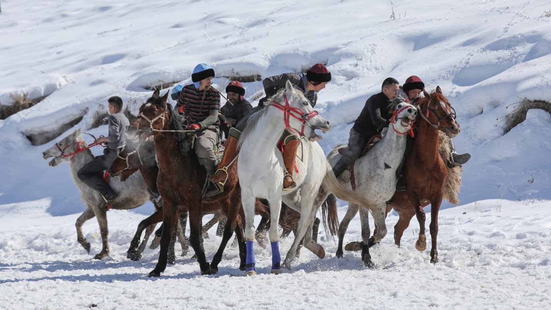 Karla kaplı zeminde yerdeki oğlak postunu kapmaya çalışan biniciler, zaman atlardan düşerek yaşadıkları tehlikeye rağmen post parçalanıncaya kadar mücadeleye devam ediyor. Mahalle sakinleri de bu çekişmeyi keyifle izliyor.