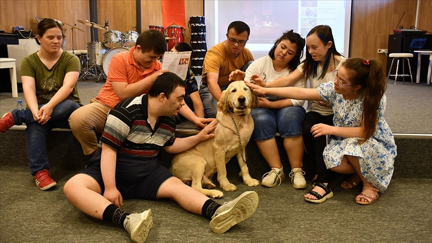 Hamidiye- Bekir Topçuoğlu Down Eğitim Kültür ve Sanat Merkezi (DOKMER) Müdürü Ayşe Yiğiter, kurumdaki öğrencilerin hem sosyalleşmesi hem de hayvan korkularını yenmesi amacıyla Ankara'da özel bir rehabilitasyon merkezinde eğitim gören labrador cinsi köpeği okula getirdi.