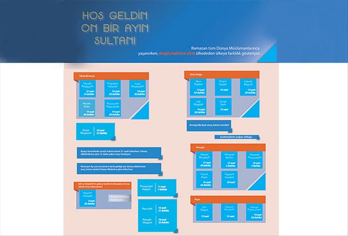 Dünya genelindeki 1,5 milyardan fazla Müslüman, yaşadıkları ülkelere göre birbirinden oldukça farklı sürelerle oruç tutuyor. Oruçlu kalma süresinin en uzun olduğu İskandinavya'da, İzlanda'nın başkenti Reykjavik'de 21 saat 13 dakika, Finlandiya'nın başkenti Helsinki'de 19 saat 50 dakika, Stockholm, Oslo ve Kopenhag'da ise yaklaşık 19 buçuk saat oruç tutuluyor.