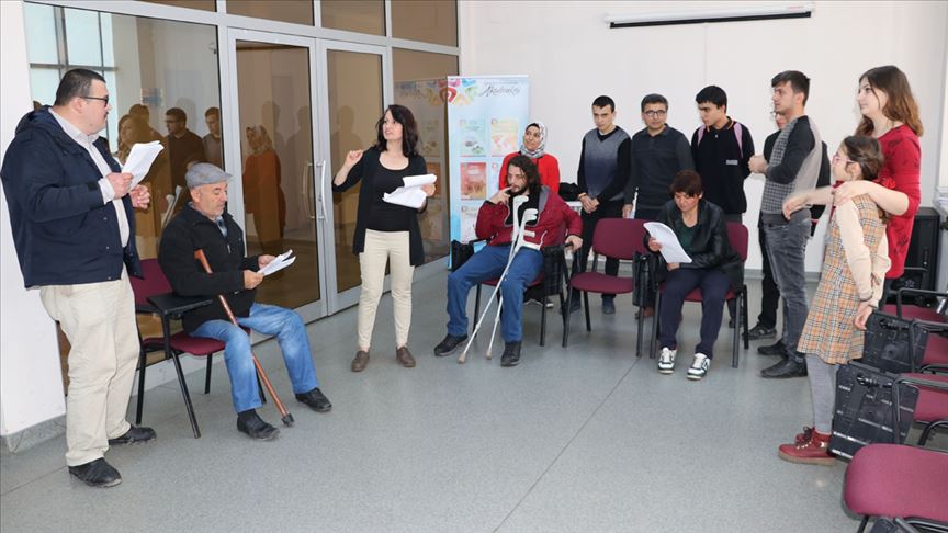 Zonguldak'ın Kilimli ilçesinde yaşayan tiyatro eğitmeni Nuray Dibek'in zeka geriliği olan kardeşinin sosyal ortamlarda yer alması amacıyla engelli bireylerin de katılımıyla oluşturduğu 15 kişilik tiyatro topluluğu, performansıyla göz dolduruyor.