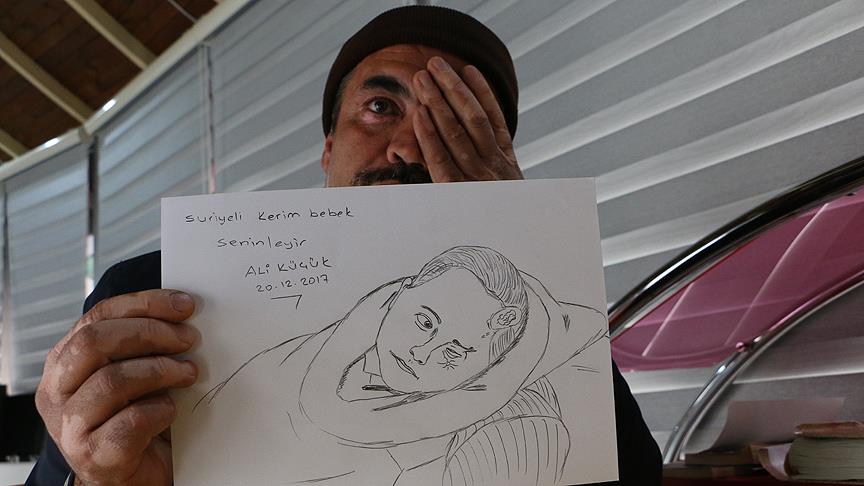 Suriye'deki iç savaşta canlarını yitiren ya da sakat kalan sivillerin çaresizliğine dikkati çekmek için bugüne kadar birçok resim çizen Küçük, yüreğinde iz bırakan Kerim bebeği de farklı bir bakış açısıyla resmetti.