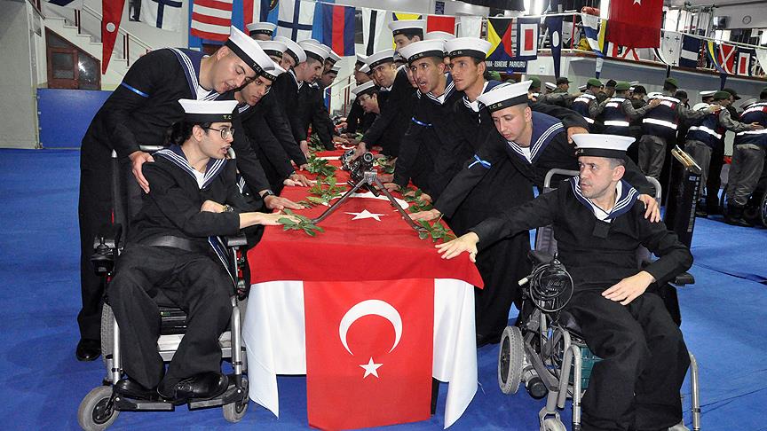Zonguldak'ın Ereğli ilçesinde Engelliler Haftası dolayısıyla Karadeniz Bölge ve Garnizon Komutanlığında gerçekleştirilen askerlik yemin törenine katılan 48 engelli asker, elbiselerini giydikten sonra yemin edecekleri masaların başına geldi.