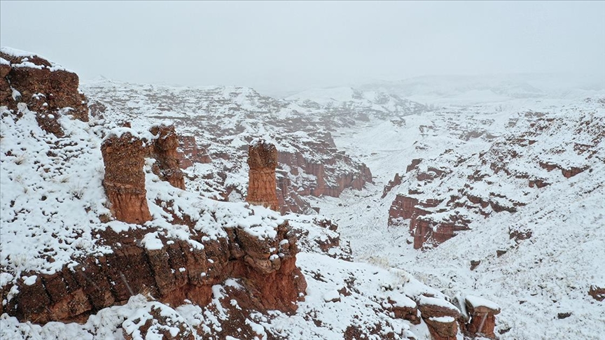 Kar yağışının ardından kırmızı-beyaz görünüme kavuşan peribacalarını her yıl binlerce yerli ve yabancı turist ziyaret ediyor.