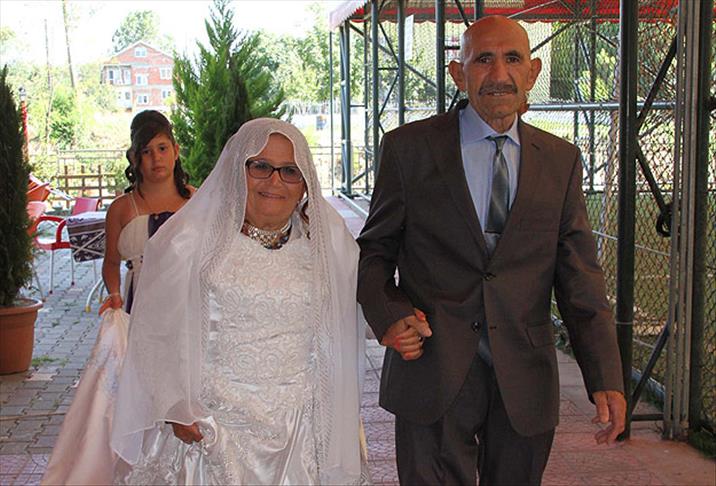 Tokat'ın Niksar ilçesinden 50 yıl önce eşini kaçırarak evlenen 4 çocuk babası ve 8 torun sahibi 70 yaşındaki Hüseyin Yıldırım, 50. evlilik yıl dönümünde eşine beyaz gelinlik giydirdi.