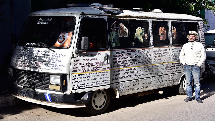 Bodrum'da 1982 model minibüsünü eve dönüştüren Şenol Özbakan, sokakta bulup büyüttüğü 5 köpeğiyle yaşıyor.
