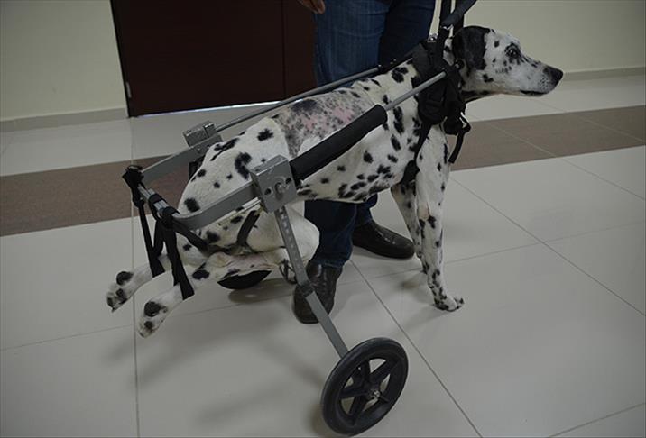 Vücuduna takılan tekerlekli yürüteç yardımıyla yürüyebilen köpek, fizik tedaviyle sağlığına kavuşturulmaya çalışılıyor.