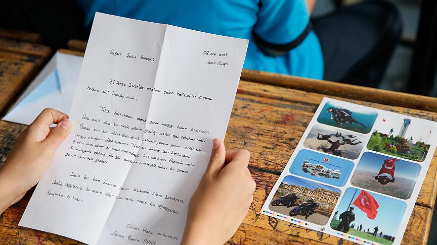 İlk kadın ilçe jandarma komutanı Songül Yakut'un helikopter kazasında hayatını kaybetmesi kendilerini derinden etkileyen Çiğli ilçesindeki Gülen Kora Ortaokulunun kız öğrencileri, hislerini şehidin annesine ulaştırmak, acısını paylaşarak ona destek olmak için mektup yazmaya karar verdi.