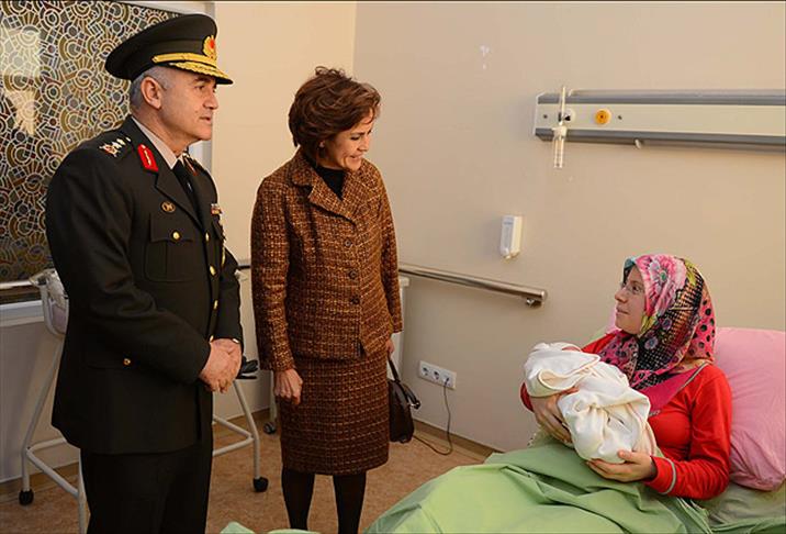 Adana 6. Mekanize Piyade Tümen ve Garnizon Komutanı Tümgeneral Sezai Bostancı, eşi Selma Bostancı ile Özel Metro Hastanesi'nde doğum yapan şehidin eşi Seda Tosun'u hastane odasında ziyaret etti.
