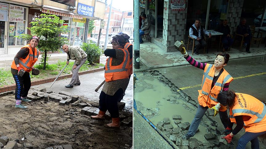 Sokak ve mezarlıklarda temizlik yapan, park bahçe düzenlemesinde çalışan kadınlar, kaldırım taşlarını sökme görevini de yerine getiriyor.