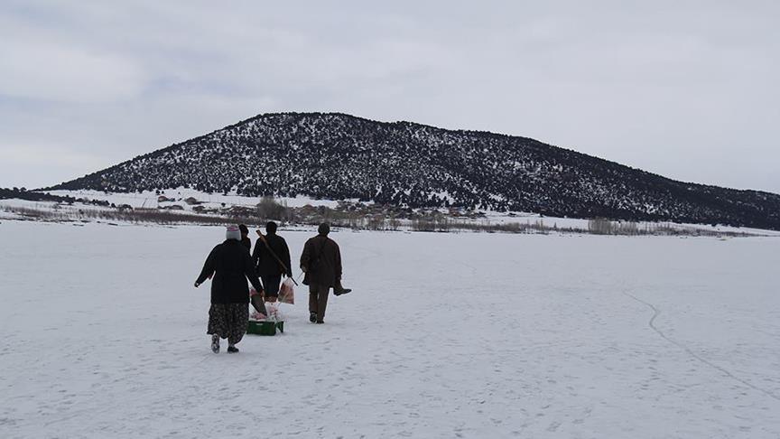 Beyşehir Gölü'ndeki Mada Adası'nda yaşayanlar, göl yüzeyinin donmasının sonucu ulaşımı yürüyerek sağlıyor.