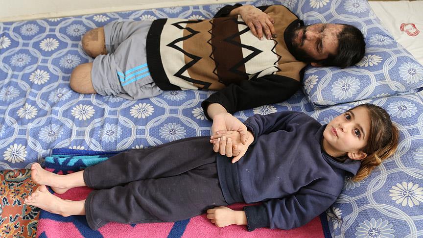 Suriye'nin İdlib kentinde rejim birliklerine ait savaş uçaklarından atılan varil bombası nedeniyle iki bacağını, sağ el parmaklarını, gözlerini ve işitme yetisini kaybeden 27 yaşındaki Mamun Halid Nasır, yaşamını yatağa mahkum şekilde sürdürüyor. Nasır'ın 5 yaşındaki kızı Gözyaşı, "Türkiye'deki doktorlara sesleniyorum, benim gözlerimi alıp babama verin. O görsün ve beni sevsin. Allah onu başımızdan eksik etmesin" sözleriyle babasına sevgisini dile getiriyor.