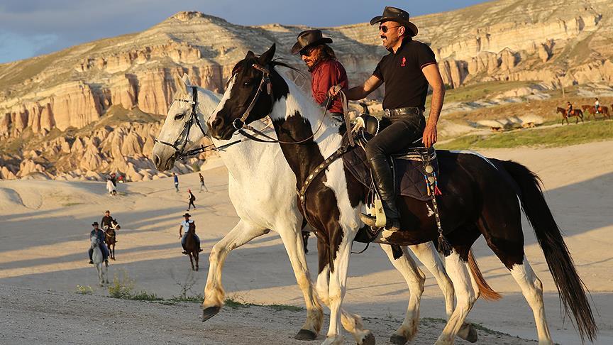 Pers dilinde "güzel atlar ülkesi" anlamına gelen Kapadokya'da, yaklaşık 20 yıldır turistlere atlı turlar düzenleyen Rahmi Özgür, çizmesinden şapkasına, kovboy tarzıyla ilgi çekiyor.