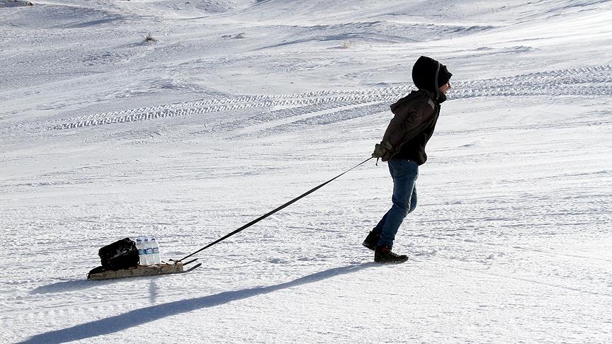 Abalı köyünde yaşayan dört lise öğrencisi, evlerinde hazırladıkları ve termosa doldurdukları çayı sabah erken saatte kendi yaptıkları tahta kızaklara yükleyerek kayak merkezine getiriyor.
