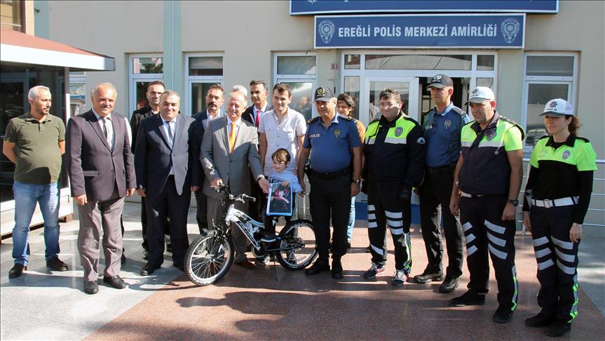 Zonguldak'ın Ereğli ilçesinde, İçişleri Bakanlığı'nın düzenlediği "Hatalı sürücüye kırmızı düdük" kampanyası kapsamındaki yarışmada babası tarafından çekilen fotoğrafı ile dereceye giren 3 yaşındaki Kayra Arslan'a, bisiklet hediye edildi.
