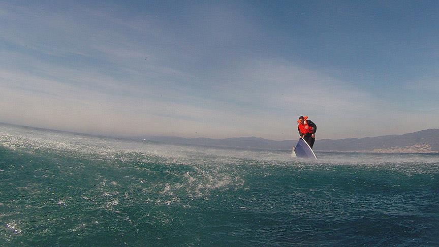 Ceylan'ın kaskındaki kamera, su üzerindeki yaşam mücadelesini de saniye saniye kaydediyor. Suya inen Ceylan, önce sığınmacıya doğru birkaç metre yüzüyor. Sığınmacıdan Türkçe ve İngilizce olarak suya inmesini isteyen Ceylan, suya inen genci yakalayarak omuz askısı ile kendisine bağlıyor.