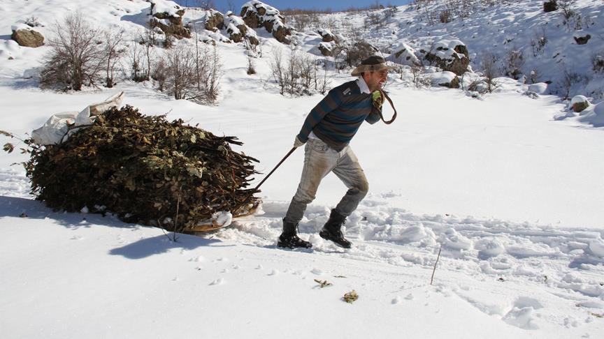 Bitlis'in Tatvan ile Hakkari'nin Şemdinli ilçesine bağlı köylerin yüksek kesimlerinde yazın ağaç dalı ve çalı biriktiren besiciler, kışın bu otları karla kaplı bölgelerden kızak ya da sürükleyerek köye indirerek hayvanlarını yemliyor.