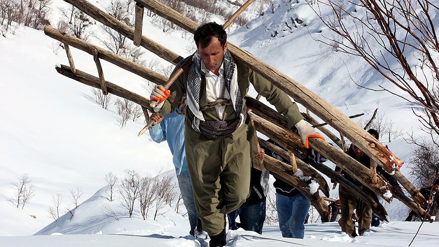 Hasköylüler, yazın dağlarda topladıkları otları ağır kış koşullarında hayvanları için kızaklarla taşıyorlar.