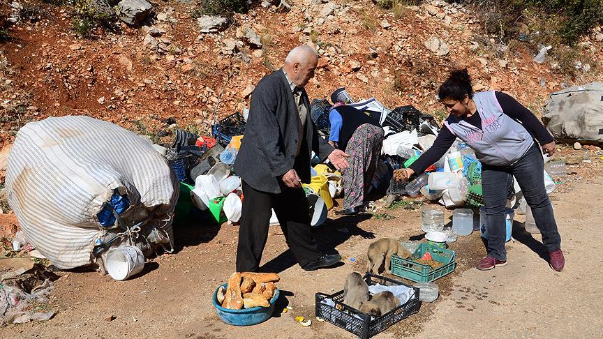 Ev hanımı Gülcan ve emekli eşi Mehmet Pantır, kendi olanakları ya da hayvanseverlerin yardımıyla temin ettikleri mamaların yanı sıra komşulardan topladıkları ekmek ve yemek artıklarını, iki günde bir çöplüğe getirerek hayvanları besliyor.