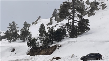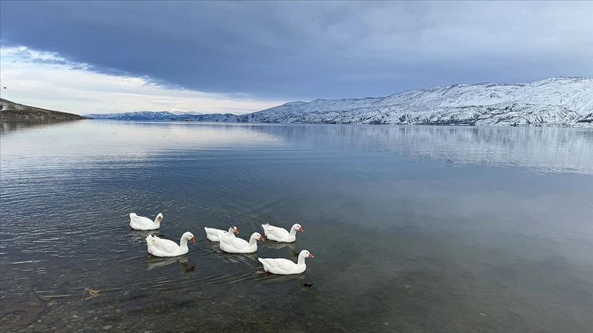 Karla kaplı dağ ve kazların yüzdüğü Hazar Gölü, güzel görüntü oluşturdu.