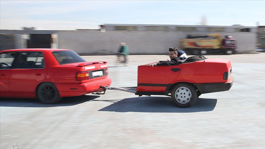 Kendi imkanlarıyla arabayı ortadan ikiye bölen Köker, arabanın üstünü de açarak römork haline getirdi.