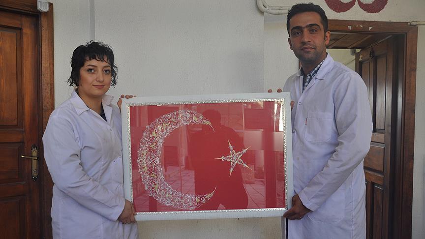 Afyonkarahisar'a yerleşen İranlı tezhip ve minyatür sanatçısı Farid Ardalan ile Samire Seyid Muhammedi çifti, Türk bayrağını tabloya işledi.