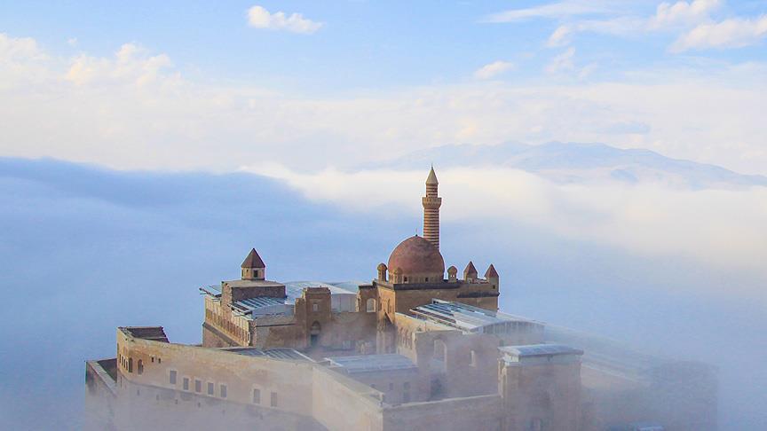 Bulunduğu konum nedeniyle "kartal yuvası"nı andıran İshakpaşa Sarayı'nın etrafını kaplayan sis bulutlarıyla masalsı bir manzara ortaya çıktı.