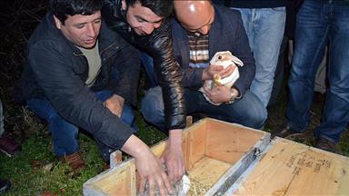 Kafeslere bırakılan tavşanlar, Yüzüncü Yıl Üniversitesi (YYÜ) Yaban Hayatı Koruma ve Rehabilitasyon Merkezi Müdürü Lokman Aslan öncülüğündeki ekip ile Van Gölü havzasındaki çeşitli bölgelere götürülerek doğaya salındı.