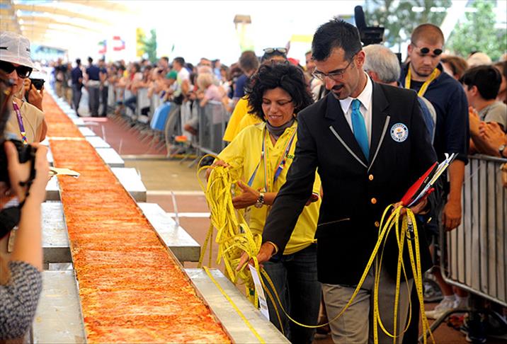 İtalya Ulusal Pizzacılar Federasyonu’na bağlı 80 pizza ustası, dünyanın en uzun pizzasını hazırlamak için bin 700 kilogram Mozzarella peyniri, bin 500 ton domates sosu ve 150 şişe de ekstra sızma zeytinyağı kullandı.