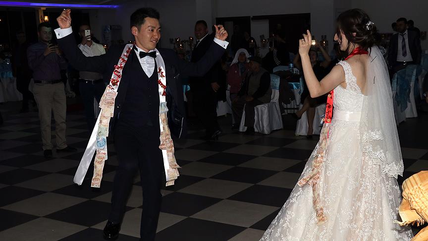 Aydın'da bir salonda düzenlenen düğün merasiminde yöresel kıyafetler giyen Japon damat zeybek oynadı. Renkli görüntülerin oluştuğu düğünde davetliler, damadın zeybek performansını fotoğrafladı.