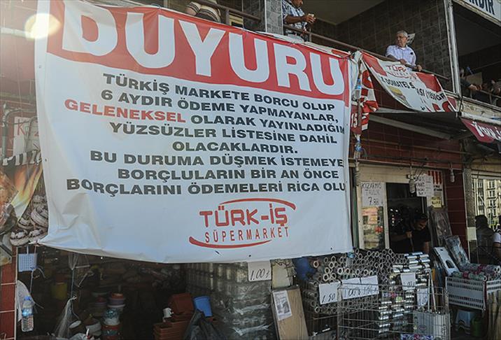 Üzerinde "Duyuru, Türkiş Market'e borcu olup 6 aydır ödeme yapmayanlar, geleneksel olarak yayınladığımız yüzsüzler listesine dahil olacaklardır. Bu duruma düşmek istemeyen borçluların bir an önce borçlarını ödemeleri rica olunur" yazılı afişin benzerini yıllar önce de astıklarını anlatan Uçan, bu yöntemle alacaklarının büyük kısmını tahsil ettiklerini söyledi.