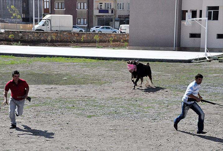 Erzurum'da, demir korkulukları yıkarak kaçan kurbanlık boğa, kasap ve mahalleli tarafından 11 kilometre kovalandıktan sonra, iğneyle uyuşturularak kesildi.