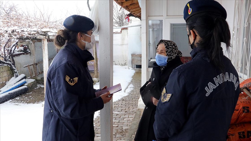 İl Jandarma Komutanlığında görevli jandarma astsubaylar Gonca Türel ve Saadet Öz, Yozgat Valiliğince desteklenen "Güçlü Aile, Güvenli Gelecek Projesi" kapsamında, köylerde çalmadık kapı bırakmayarak kadınları bilgilendiriyor.