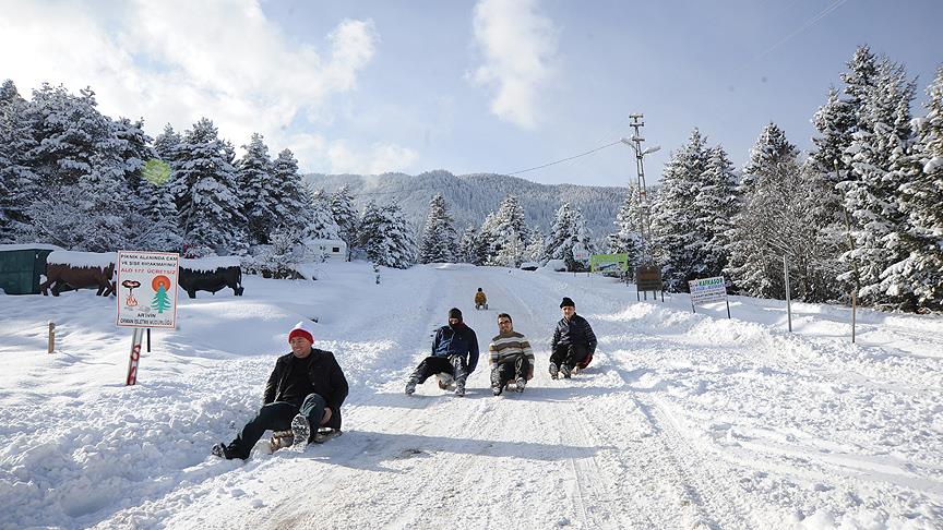Beyazla örtülü doğanın eşsiz güzelliğini fotoğraflama şansı yakalayan vatandaşlar, aynı zamanda tahta kızaklarla kayak keyfi yaptı.