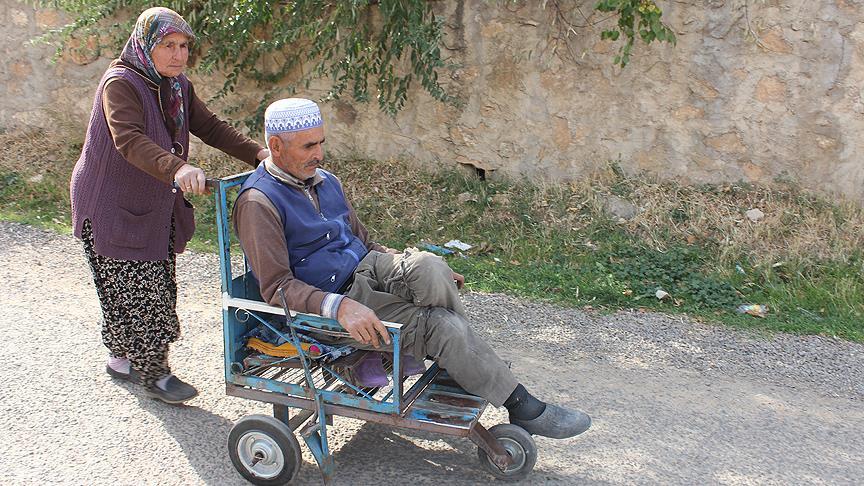 82 yaşındaki Zarife Yıldırım, özenle bakıp büyüttüğü 58 yaşındaki engelli oğlunu, köydeki demirci ustasının kapı profilinden yaptığı 3 tekerlekli arabayla her gün köy kahvehanesine götürüyor