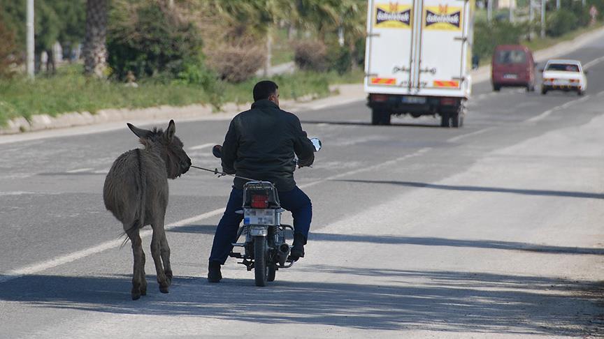 Aydın-Bodrum karayolunda motosikletiyle seyir halindeki bir sürücünün, aracına bağladığı eşeğini çekmeye çalıştığı görüldü. Boynundaki iple motosiklete bağlı hayvanı, aracının gazına basarak hareket etmeye zorlayan kişi, yoldaki diğer sürücülerin tepkisine neden oldu.