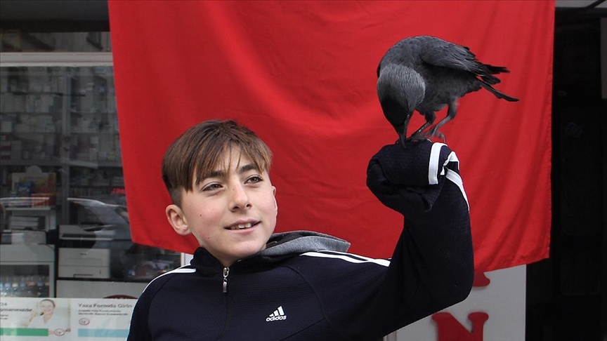 İlçede esnaflık yapan Mehmet Göymen, yaklaşık bir yıl önce iş yerinin önünde yavru bir karga buldu. Göymen'in iş yerine alarak yem ve su verdiği kuş bir daha iş yerinden ayrılmadı.