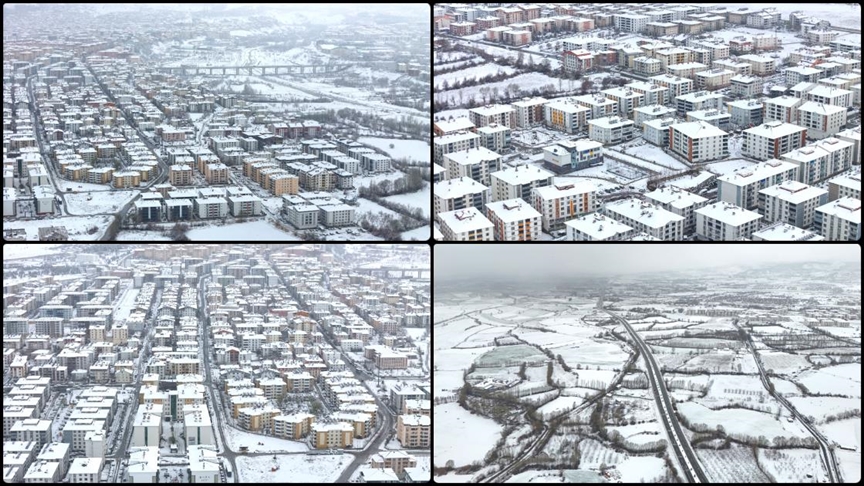 Kentin çevresindeki dağlar ve çeşitli yapılar, kar yağışıyla güzel manzara sundu.