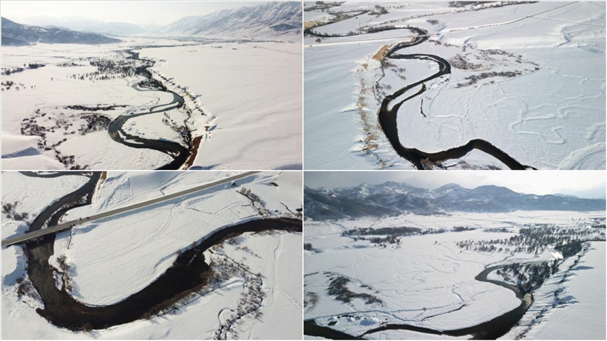 Munzur Çayı'nın da menderesler oluşturarak geçtiği milli parkın karlı manzarası dronla görüntülendi.