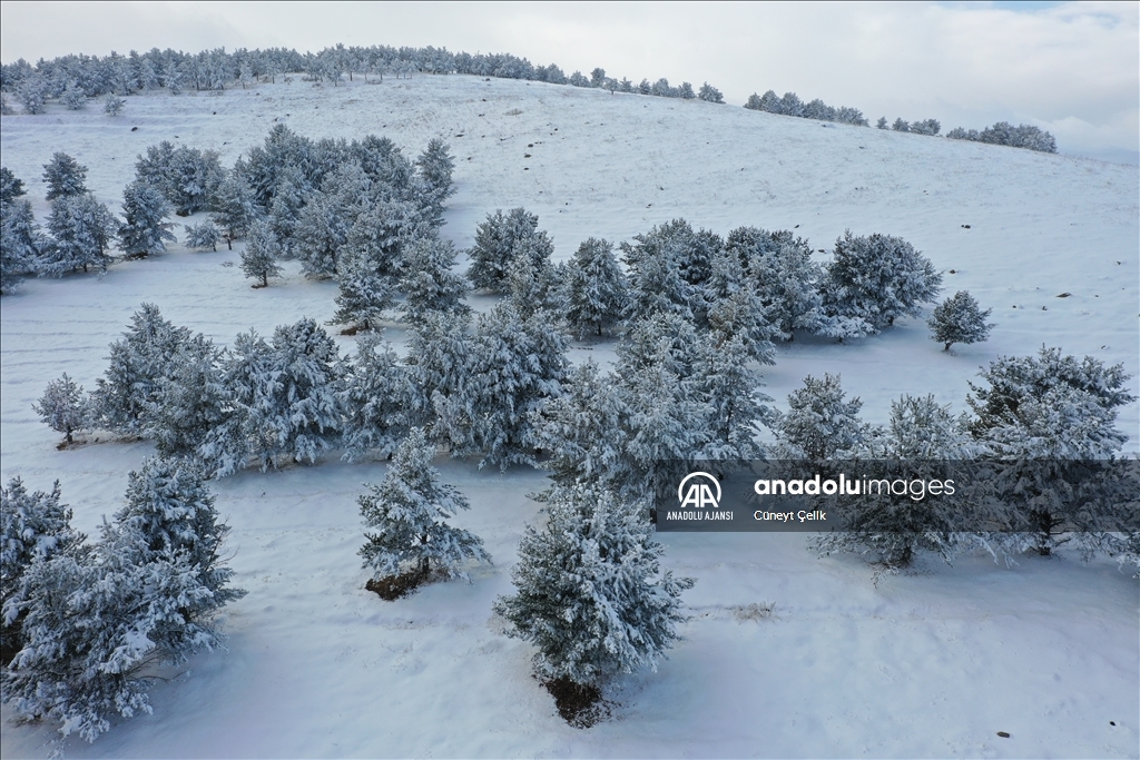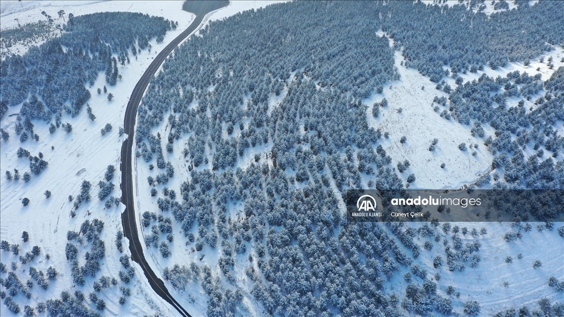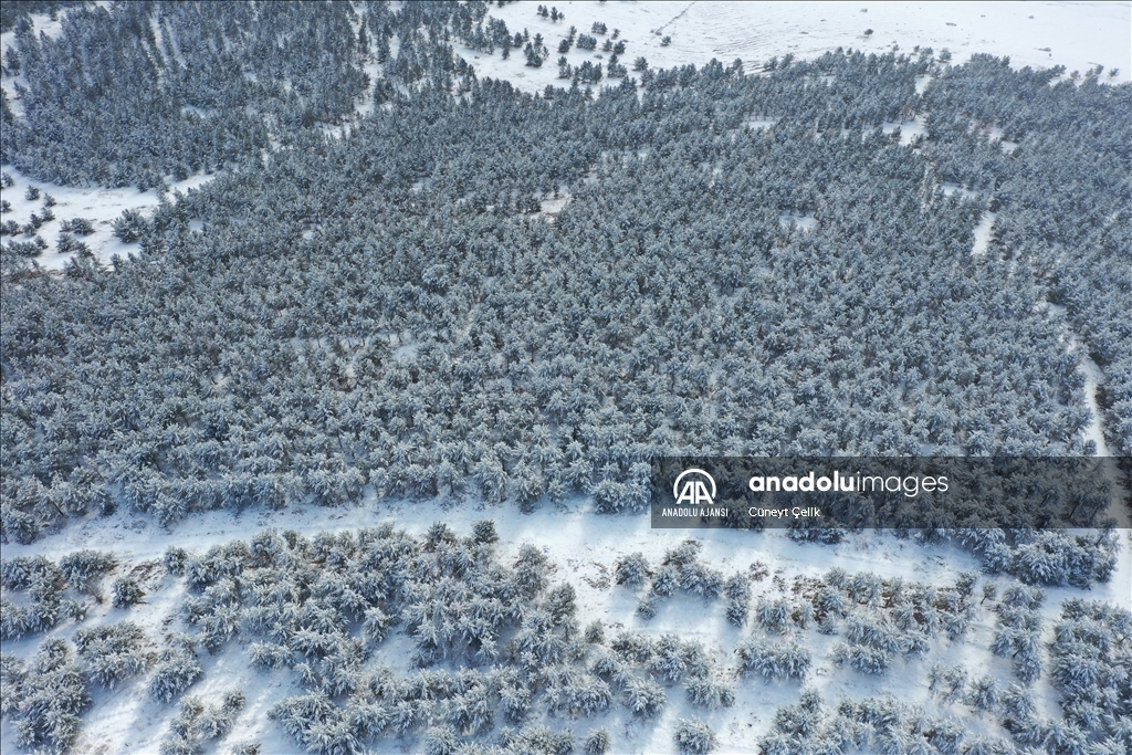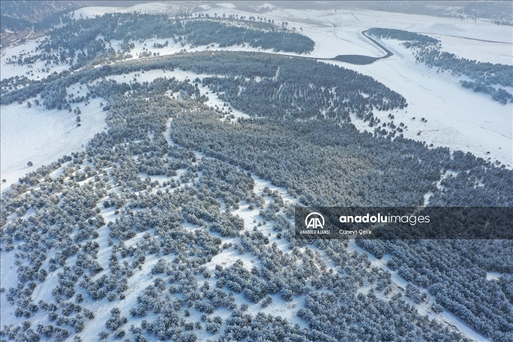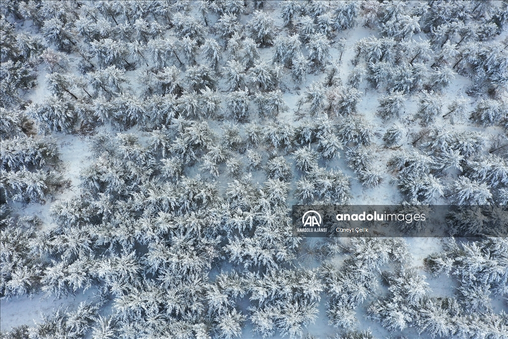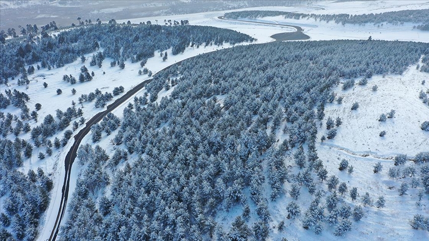 Boz ayı, vaşak, kurt, tilki başta olmak üzere birçok yaban hayvanına doğal yaşam alanı sunan sarıçam ormanlarını, önceki günlerde etkili olan karla beyaz örtü kapladı.