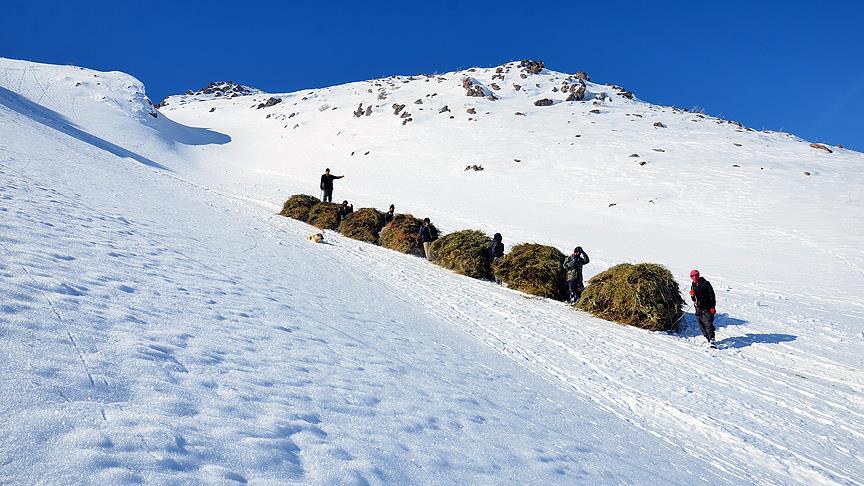 İlçeye 25 kilometre mesafedeki Yürekli köyünde, sabahın ilk ışıklarıyla yanlarına aldıkları kızaklarla biriktirdikleri otların bulunduğu bölgeye yürüyen vatandaşlar, kar kalınlığının iki metreye ulaştığı dağın zirvesine yaklaşık 4 saatte çıkıyor.