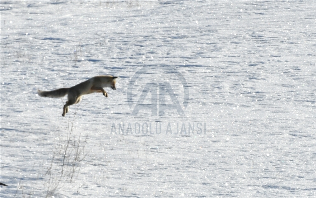 Kar altındaki farelere odaklanan kızıl tilkiler, yaklaşık 20-30 saniye hiç kıpırdamadan avının hareketini takip ediyor ve bir anda yaklaşık 1 metre zıplayarak kafasını kara gömüyor.
