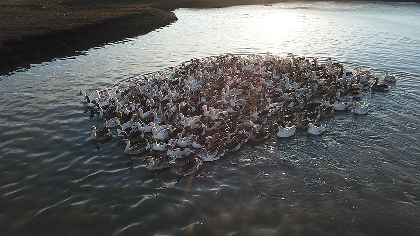 Belli bir süre kapalı çiftliklerde kalan kazların açık havada suyla buluşması ilginç görüntüler oluşturuyor. Gölde sürü halinde yüzen kazlara turistler de ilgi gösteriyor.