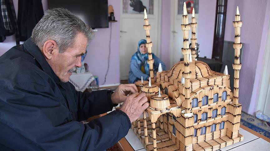 Aydın'ın İncirliova ilçesinde oturan 69 yaşındaki Hasan Efe, 8 bin 500 kibrit çöpünden 4 minareli cami maketi yaptı.