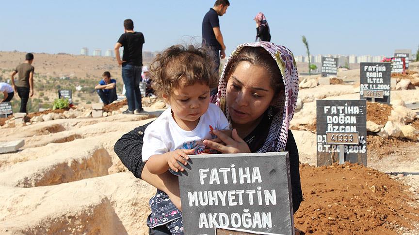 Gaziantep'te sokak düğününe yönelik bombalı saldırıda hayatını kaybedenlerin mezarları, yakınları tarafından Kurban Bayramı'nın ilk gününde ziyaret edildi.