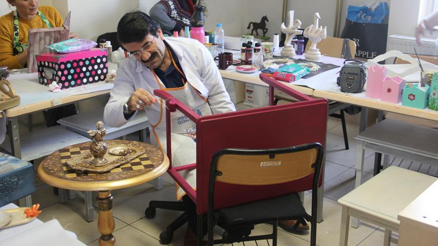 Gaziantep'te 6 kız babası Tahir Alkan, genellikle kadınların tercih ettiği dekoratif süsleme kursuna katılıyor.