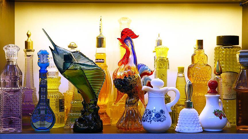 Çınar, ilginç kolonya şişelerini bulmak için Türkiye'deki antika pazarlarını sıkı takibe alırken son 10 yılda başlayan bu merakıyla değişik şekillerde 350 şişeyi bir araya getirdi.