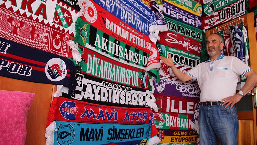 Balıkesir'in Sındırgı ilçesinde hazır yiyecek işiyle uğraşan 54 yaşındaki Nejlet Demirözer, dünyanın dört bir yanından futbol takımlarının atkılarından oluşan yaklaşık 300 parçalık koleksiyonunu iş yerinde sergiliyor.