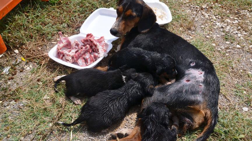 İlçedeki Çınargeçidi Mesire Alanı'nda piknik yapan vatandaşlar, karnında yara olan köpeğin yürüyemediğini, yavrularının da hayvanın başında beklediğini görünce durumu zabıta ekiplerine bildirdi.