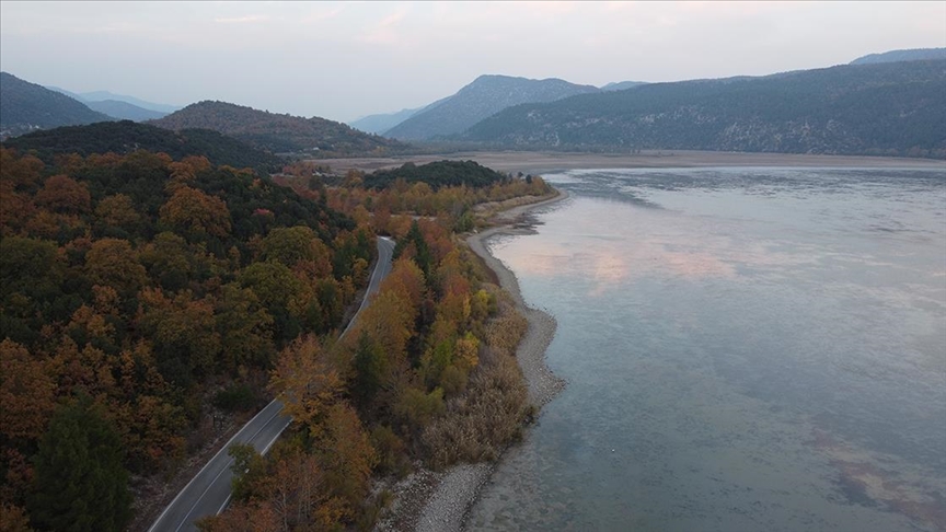 Kuraklık tehlikesiyle karşı karşıya olsa da sonbaharın gelmesiyle etrafını çevreleyen orman manzarası rengarenk bir görünüme bürünen Kovada Gölü, misafirlerine renkli bir şölen sunuyor.