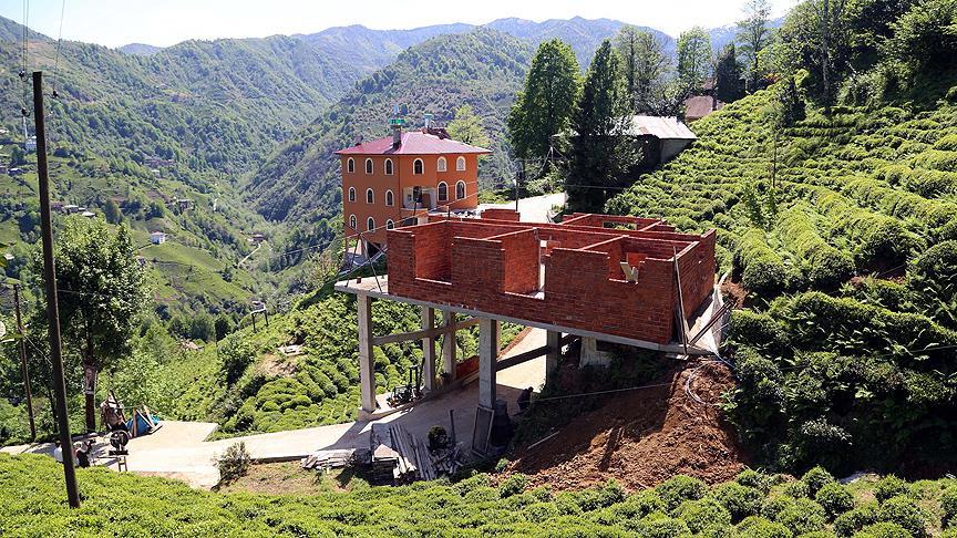 Rize'nin Çayeli ilçesine bağlı Karaağaç köyünde oturan Mehmet Demir, kış aylarında ulaşımda sıkıntı çekince çareyi arazisinden geçen yolun "üzerine" ev yapmakta buldu.